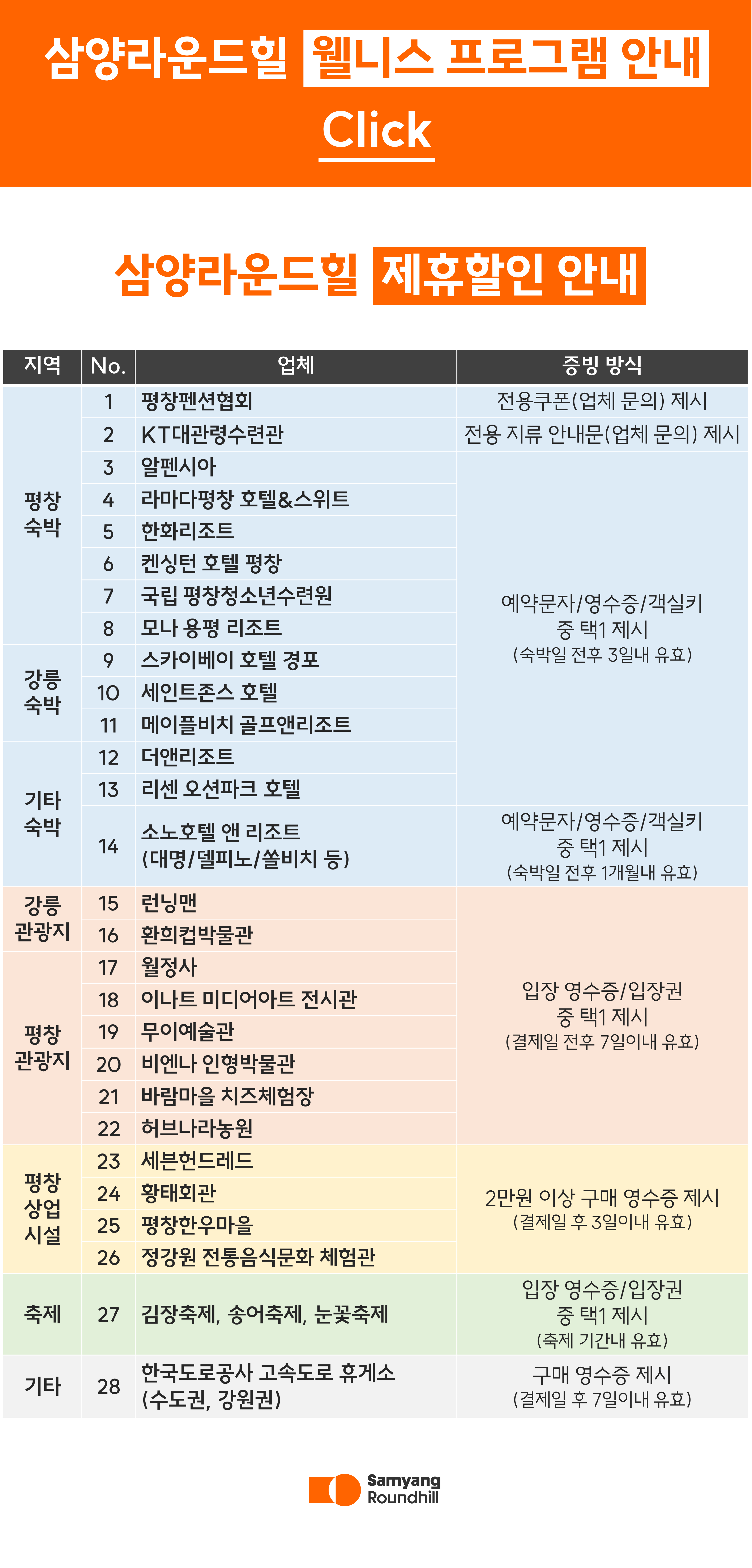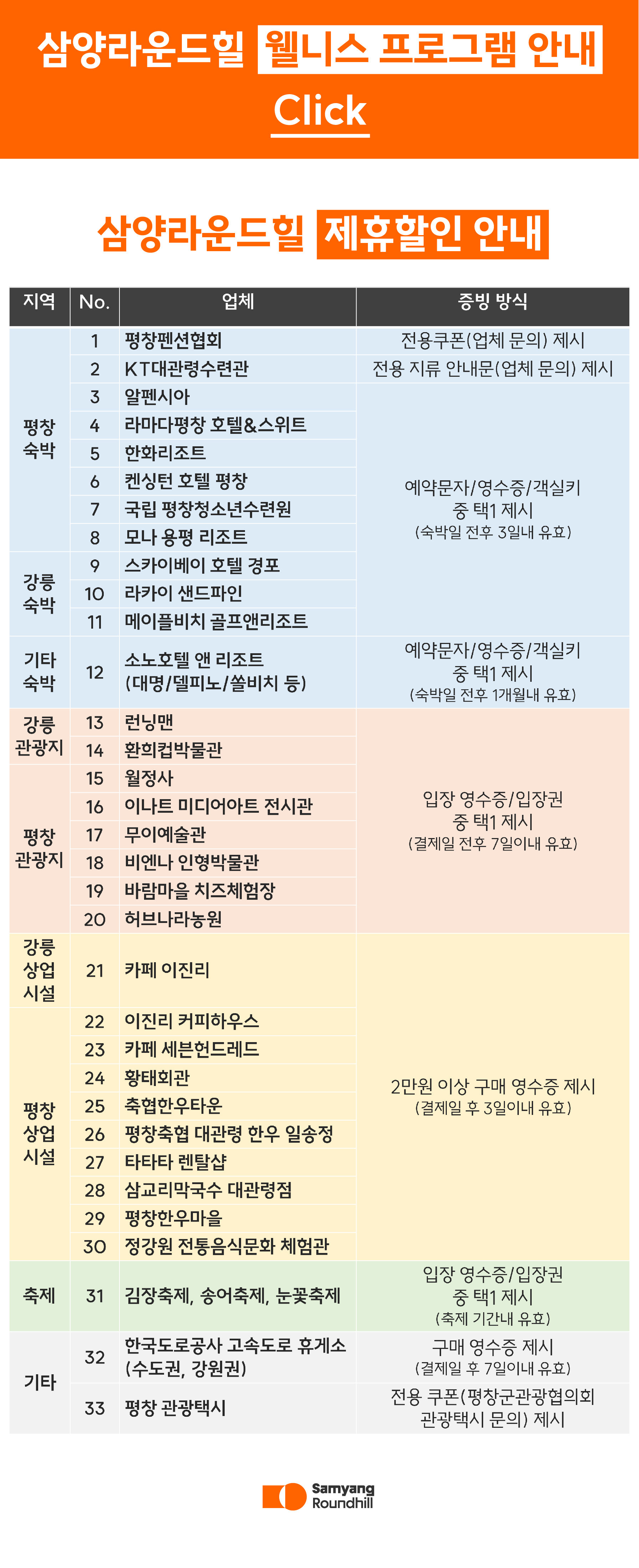 NEW! 제휴 할인 혜택 확대 2025-10-31 페이스북 그동안 삼양라운드힐과 함께해주신 고객 여러분께 감사의 마음을 담아, 더욱 풍성한 혜택을 준비했습니다.다양한 제휴처와의 협력을 통해 더 많은 분들이 편리하고 합리적으로 삼양라운드힐을 즐기실 수 있도록 할인 범위와 제휴 혜택이 확대되었습니다.항상 삼양라운드힐을 이용해 주시는고객님들께 감사드립니다. 이전글 2025년 화이트시즌 오픈 공지 다음글 2025 수능 수험생 할인 이벤트 목록