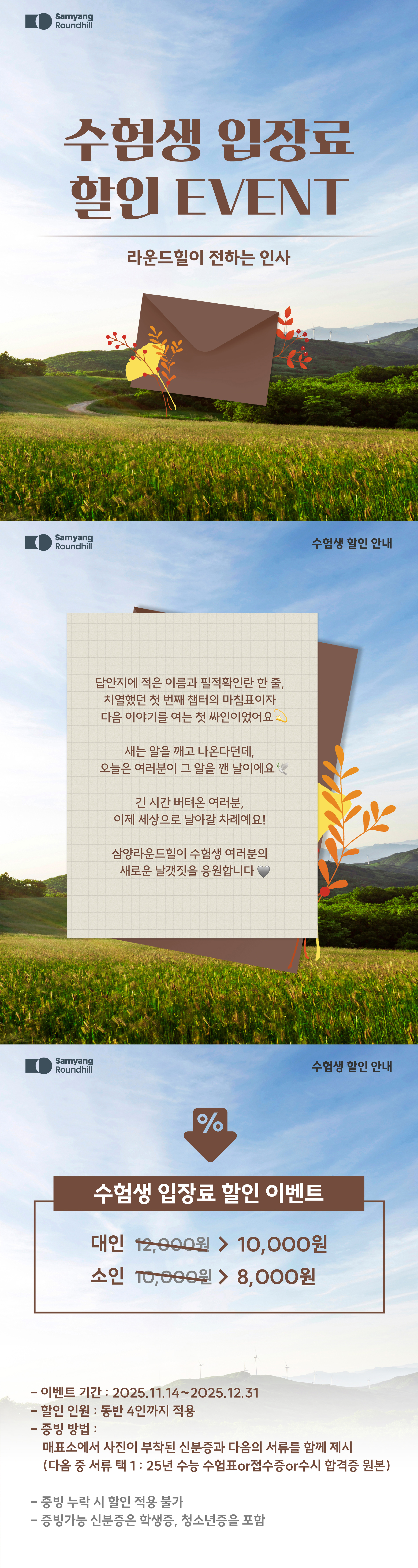 - 증빙 방법 : 매표소에서 사진이 부착된 신분증과 다음의 서류를 함께 제시 (다음 중 서류 택 1 : 25년 수능 수험표or접수증or수시 합격증 원본)