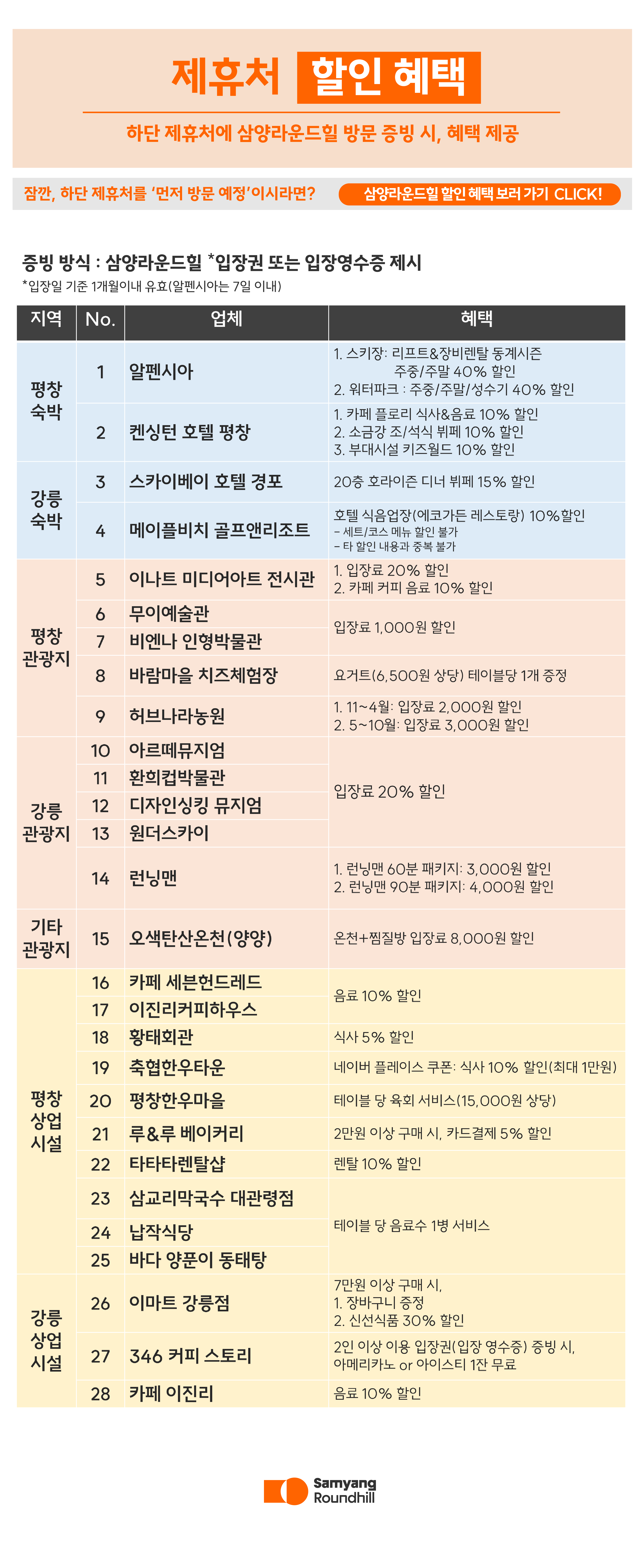 삼양라운드힐 고객 대상 : 제휴처 혜택 안내 2026-02-26 페이스북 그동안 삼양라운드힐과 함께해주신 고객 여러분께 감사의 마음을 담아, 더욱 풍성한 혜택을 준비했습니다.다양한 제휴처와의 협력을 통해더 많은 분들이 편리하고 합리적으로 삼양라운드힐을 즐기실 수 있도록 할인 범위와 제휴 혜택이 확대되었습니다.항상 삼양라운드힐을 이용해 주시는고객님들께 감사드립니다. 이전글 설연휴 스페셜 이벤트 : 사진으로 남기고, 간식으로 나누는 특별한 하루 다음글 다음 글이 없습니다. 목록