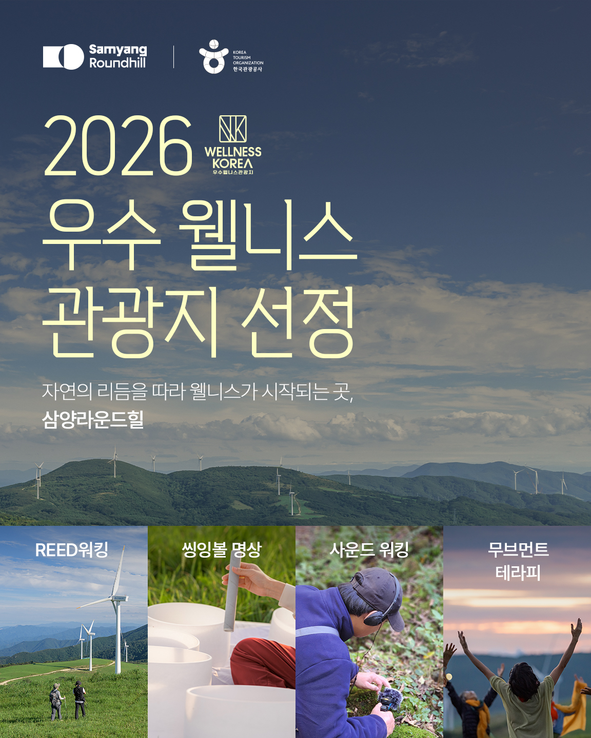 2026년 우수웰니스 관광지 선정 소식 2026-04-06 페이스북 삼양라운드힐이 한국관광공사 선정 ‘2026 우수 웰니스 관광지’로 선정되었습니다.이곳에서 머물고, 걷고, 쉬어가며 같은 시간을 나눠주신 여러분 덕분입니다.진심을 담아 만들어온 이 여정, 앞으로도 천천히, 그리고 변함없이 이어가겠습니다.함께해 주셔서 감사합니다. 이전글 2026년 그린시즌 오픈 일정 1차 공지 다음글 다음 글이 없습니다. 목록