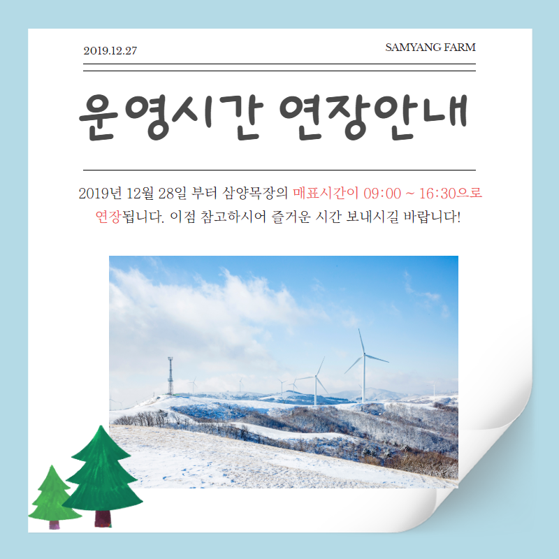 목장소식 삼양라운드힐의 새로운 소식을 확인할 수 있습니다. 삼양목장 동절기 운영시간 변경안내 2019-12-27 페이스북 NONE 이전글 2020 삼양목장 해돋이행사 안내 다음글 대관령눈꽃축제 입장권 할인안내 목록