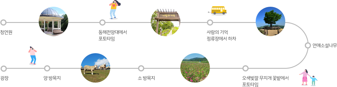 추천코스 삼양라운드힐을 즐기실 수 있는 인기 코스를 알려드립니다.(본 코스는 내부 셔틀버스를 이용하여 관람가능한 '그린시즌'을 기준으로 구성되었습니다.) 라운드코스 바람과 전망을 담아내는 가벼운 라운드힐 한 바퀴 소요시간 : 약 90분 힐코스 초원과 동물 사이, 천천히 걸으며 자연과 가까워지는 시간 소요시간 : 약 120분